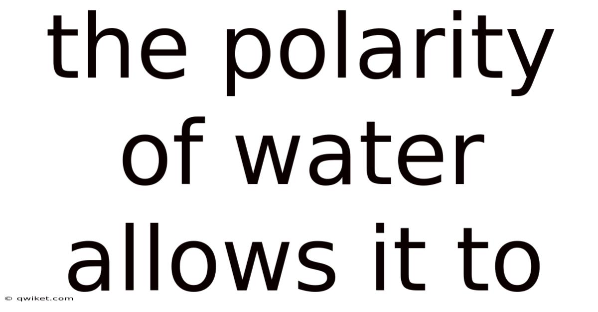 Water is often called the "universal solvent," a title earned not through hyperbole but through the intrinsic physics and chemistry of its molecular structure. The question of why water holds this distinction leads directly to the concept of polarity. In real terms, polarity refers to the separation of electric charge leading to a molecule having a positive end and a negative end. In practice, in the case of water, this separation is significant and constant, driving its interactions with other molecules. Practically speaking, this article will explore how the polarity of water allows it to dissolve ionic and polar substances, the scientific mechanisms behind this process, and the profound implications this property has for life on Earth. We will move from the microscopic arrangement of atoms to the macroscopic effects seen in living organisms and the environment Which is the point..